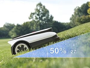 - Régulation de la vitesse en pente : à l’aide du capteur d’inclinaison, le robot de tonte iMOW® ajuste automatiquement sa vitesse sur les terrains accidentés, de manière constante.